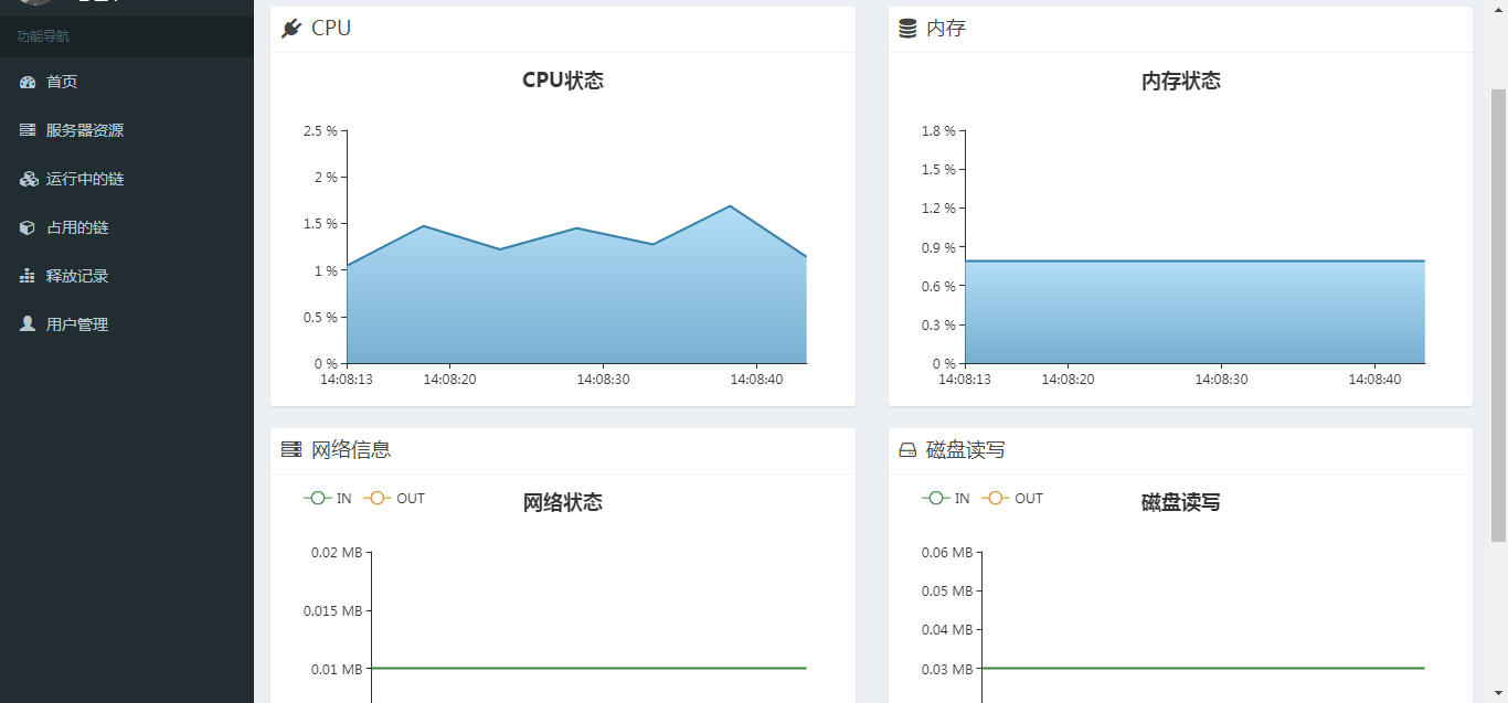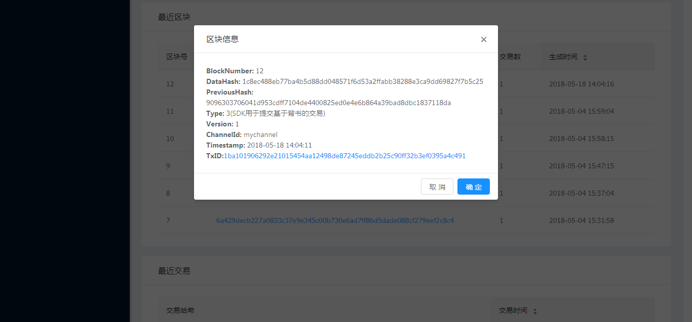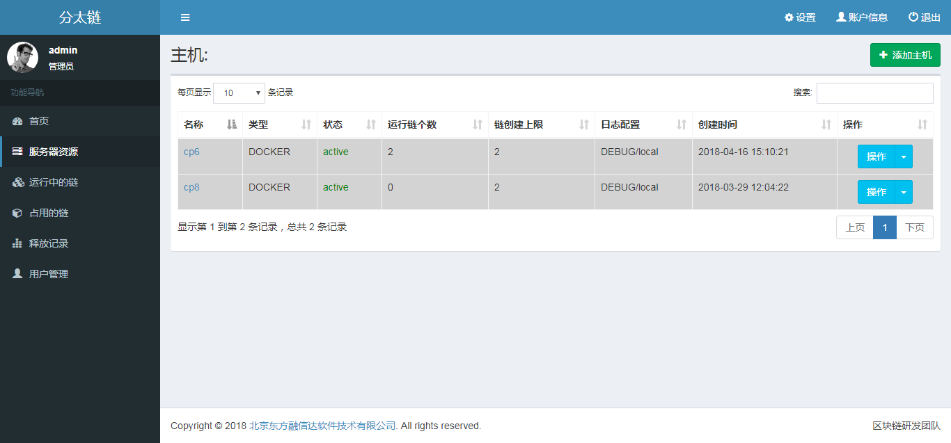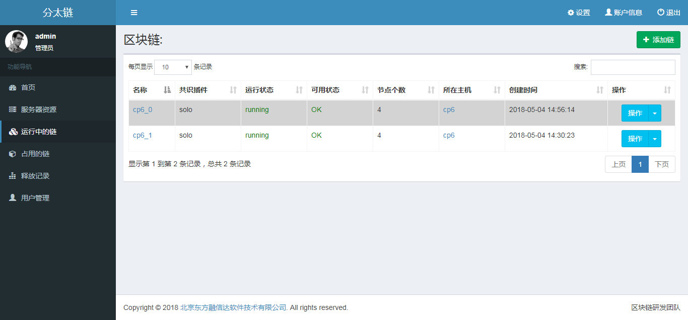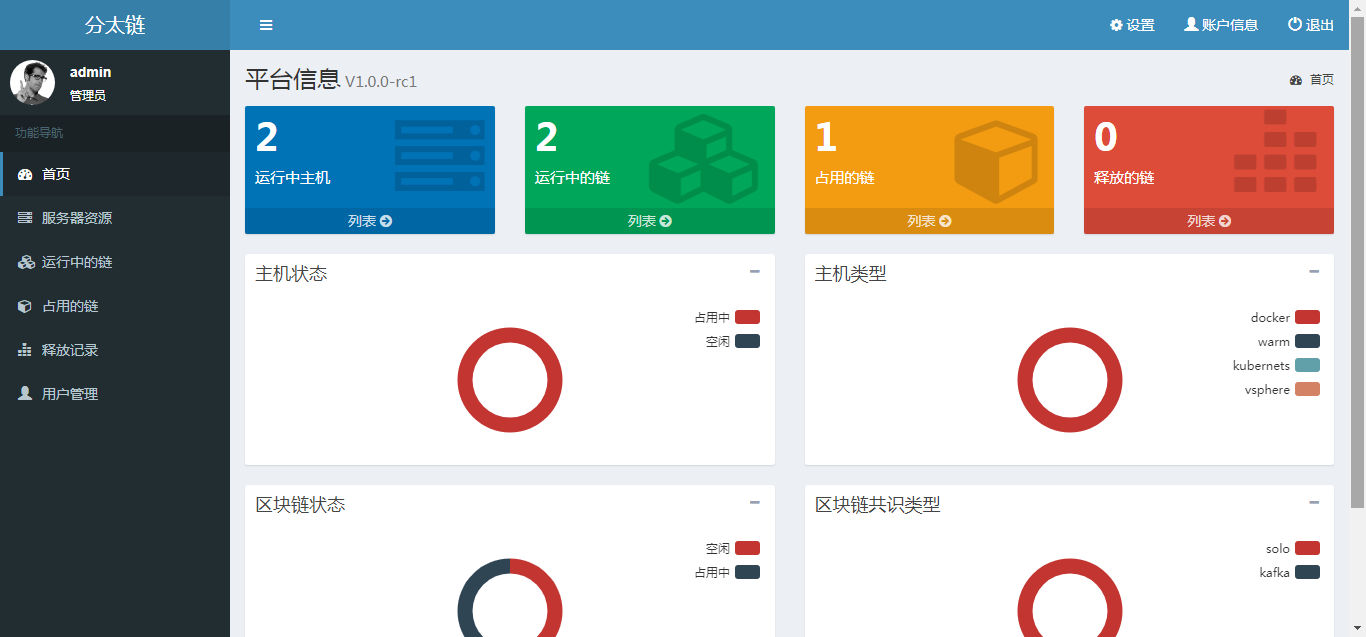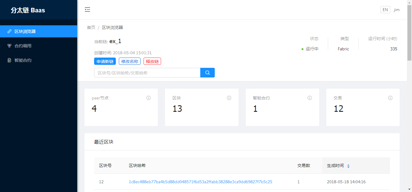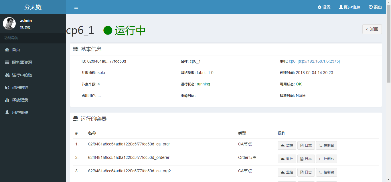 功能强大的Web管理控制平台,支持对底层云计算平台的运维,灵活确定区块链部署的规模和节点运行状态;功能完备的api接口以助力基于Hyperledger fabric的上层应用的开发,实现对区块链信息(节点,交易,区块)的实时监控、历史浏览,以及智能合约的部署、调用功能;日志分析,监控系统报警。