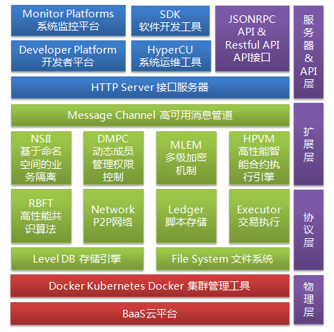 原生高性能原生智能合约引擎沙箱,支持多种语言和业务规则变化时的无缝升级;高鲁棒性RBFT核心算法,提供高效共识机制;通过namespace机制,实现多链隐私隔离的区块链架构;通过publish/subscribe消息通信,实现了共识算法、节点管理和区块存储的模块化与解耦设计。